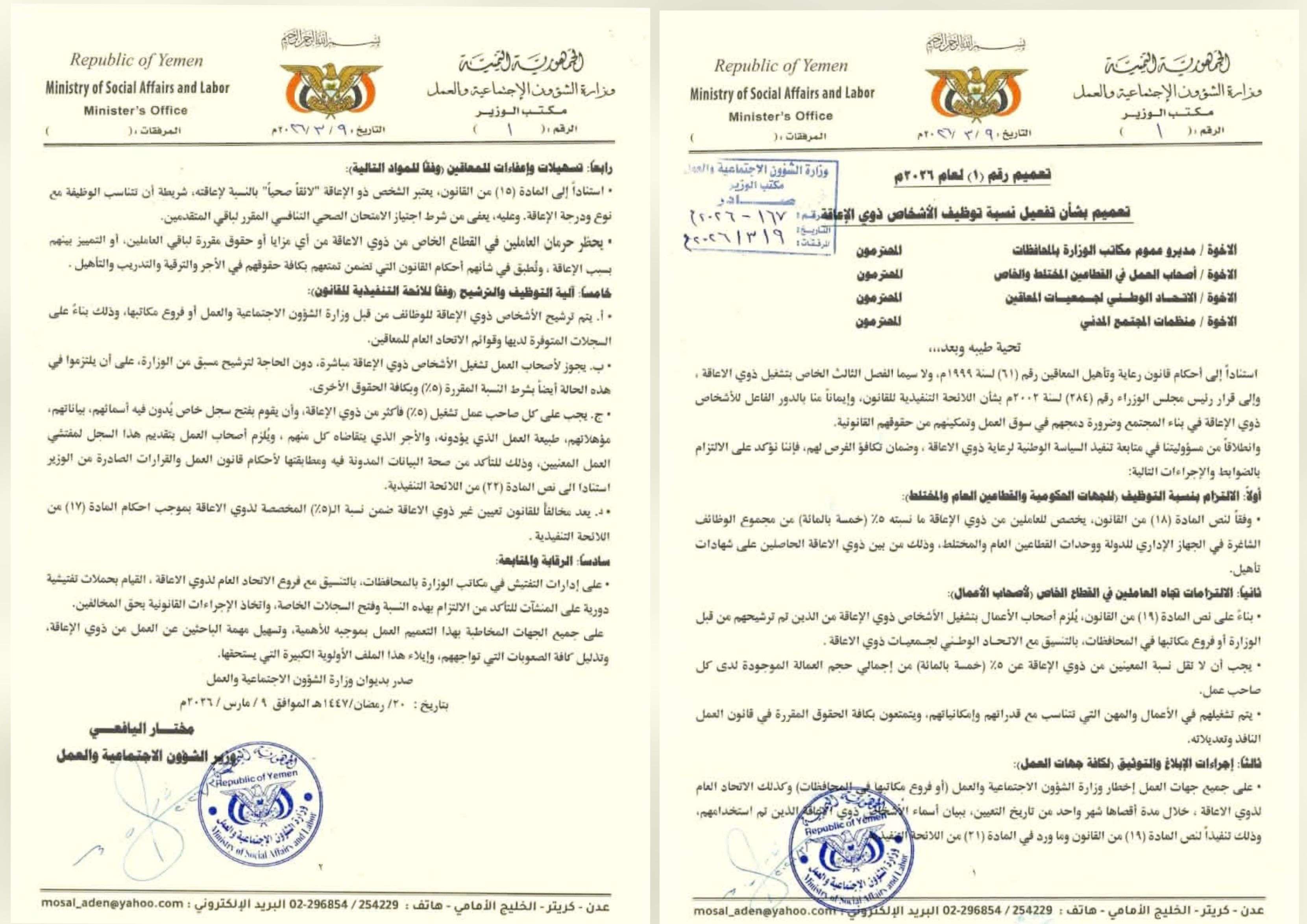 أصدرت وزارة الشؤون الاجتماعية والعمل، اليوم في العاصمة عدن، تعميماً وزارياً يقضي بتفعيل نسبة توظيف ا...