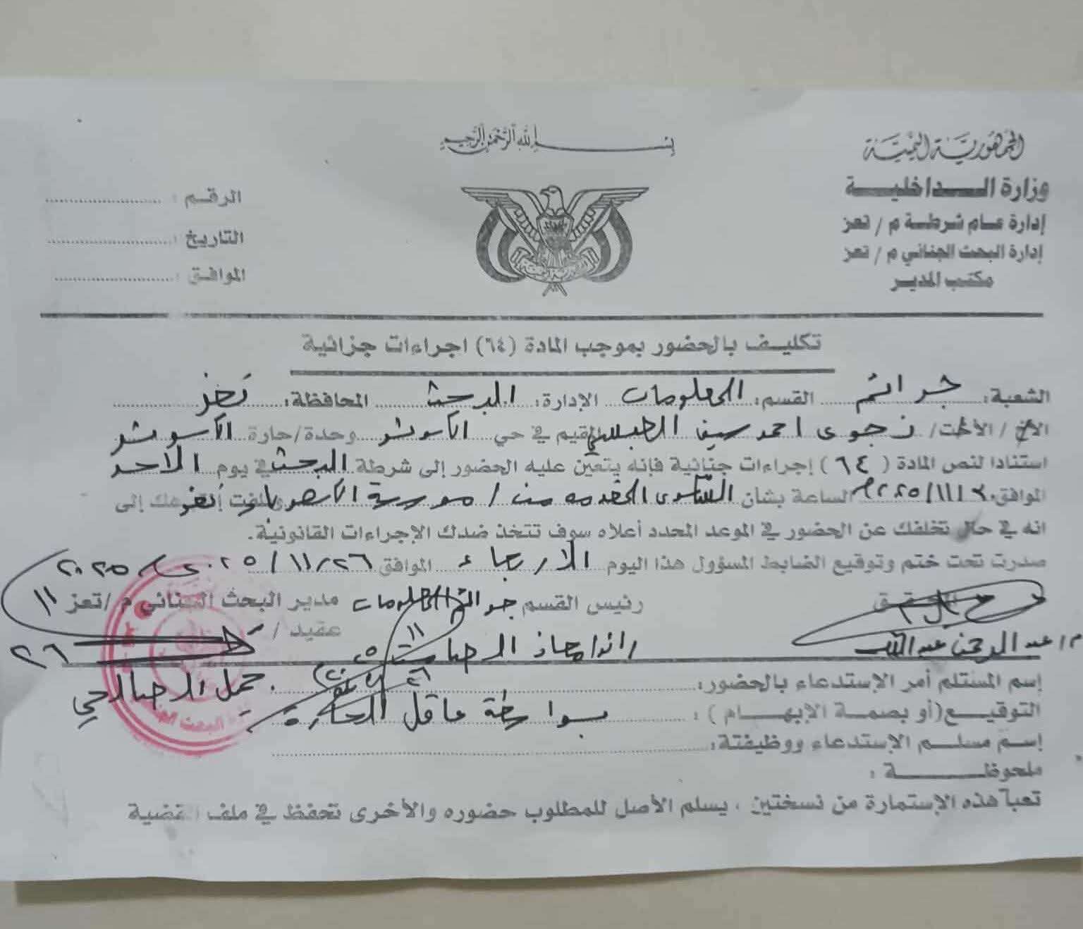 كشفت وثيقة رسمية صادرة عن إدراة البحث الجنائي بمحافظة تعز استقواء مدير عام كهرباء تعز بمنصبه على موظ...