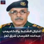 اغتيال ضابط أكاديمي اليوم في تعز مسلحون مجهولون يغتالون أستاذ القانون بجامعة مدينة #تعز والمستشار السابق لمدير أمن المحافظة العميد...
