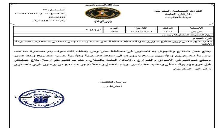 تعميم هام للقوات الجنوبية بشأن حمل السلاح بعدن
