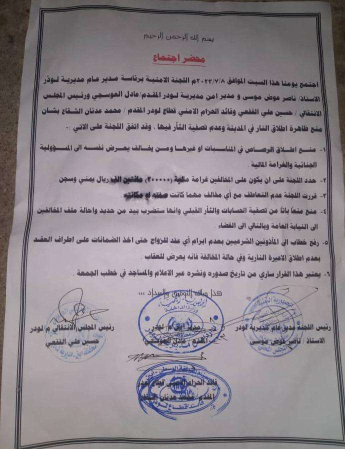 علماً بأن هذا الاجتماع الأمني أتفق على وثيقة اتخذت فيها إجراءات وغرامات مالية لمن يخالف ذلك ومن أهم بنود الإتفاق.