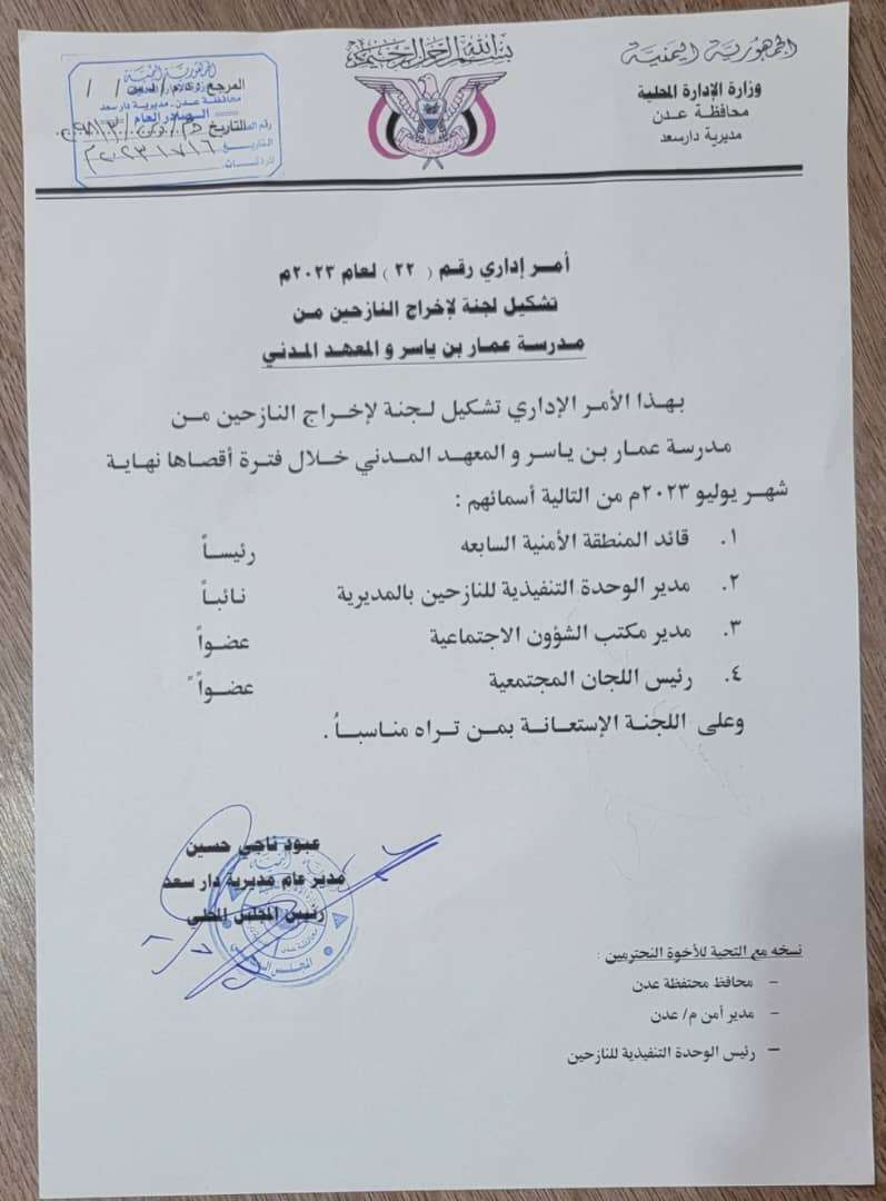 وجه مدير عام مديرية دارسعد بالعاصمة عدن الاستاذ عبود ناجي حسين بتشكيل إخلاء لإخراج النازحين من مدرسة عمار بن ياسر والمعهد المدني (الزراعي السعودي) ، الحكومية الذي تم اقتحامها منذ سنوات عدة.