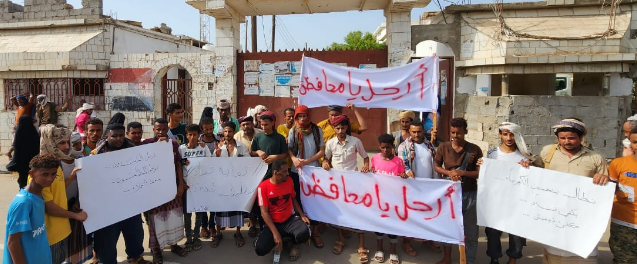 وخلال الوقفة الاحتجاجية رفع المحتجون من أبناء محافظة أبين لافتات تطالب برحيل محافظ المحافظة.