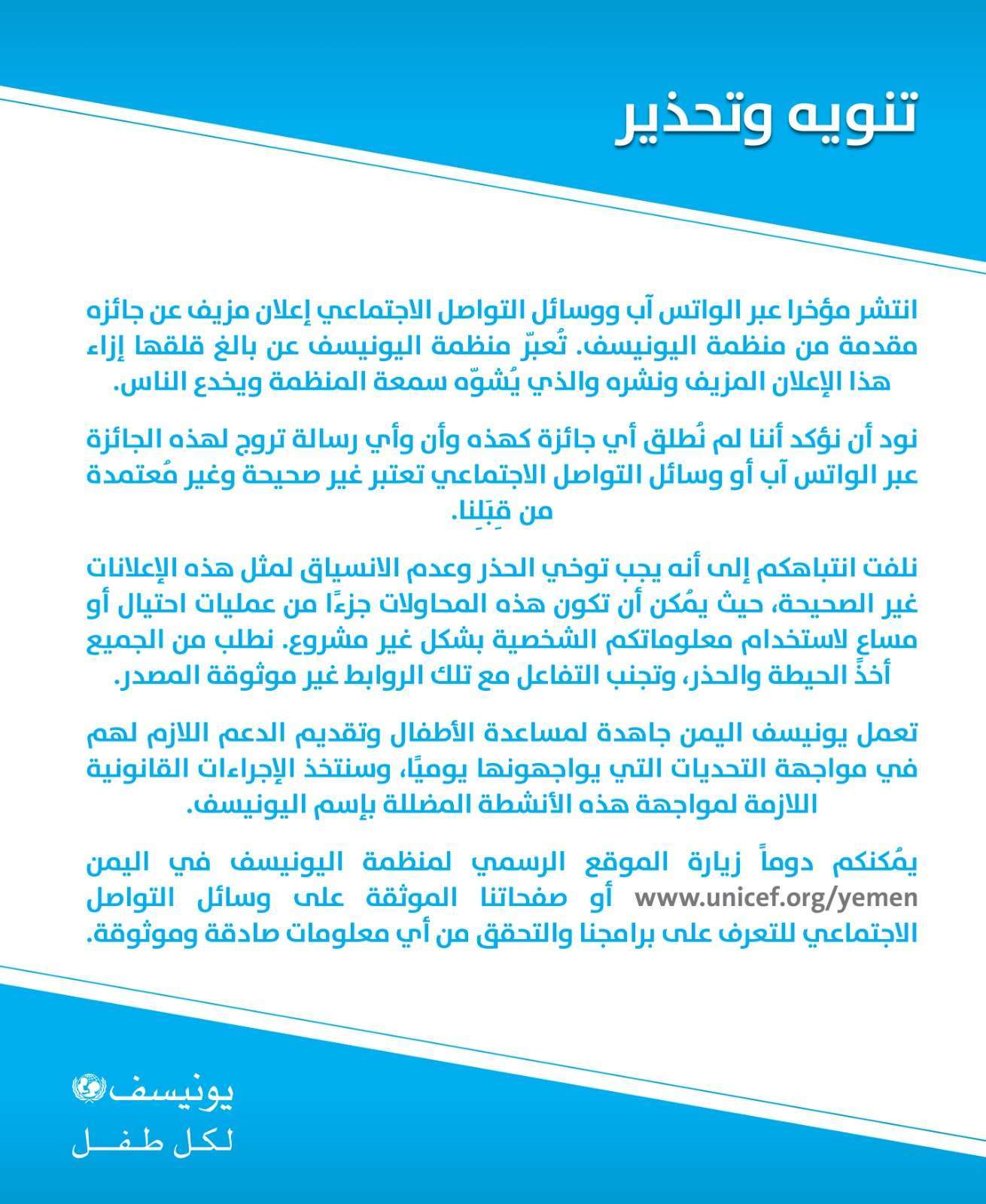 عبرت منظمة اليونيسف عن بالغ قلقها إزاء إعلان مزيف انتشر مؤخرا على الواتس آب ووسائل التواصل الاجتماعي مفاده أن هناك جائزة مقدمة منها.