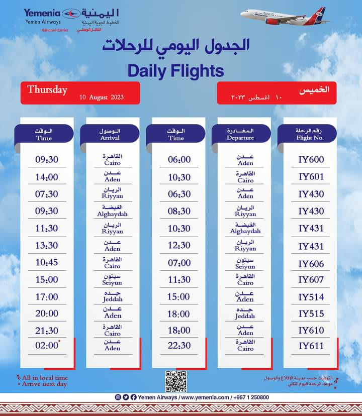 حفظ الصورة مواعيد رحلات طيران اليمنية ليوم غد الخميس 10 أغسطس 2023 الأربعاء ٠٩ أغسطس ٢٠٢٣ الساعة ٠٦:٥٣ مساءً متابعات/ مجال نت