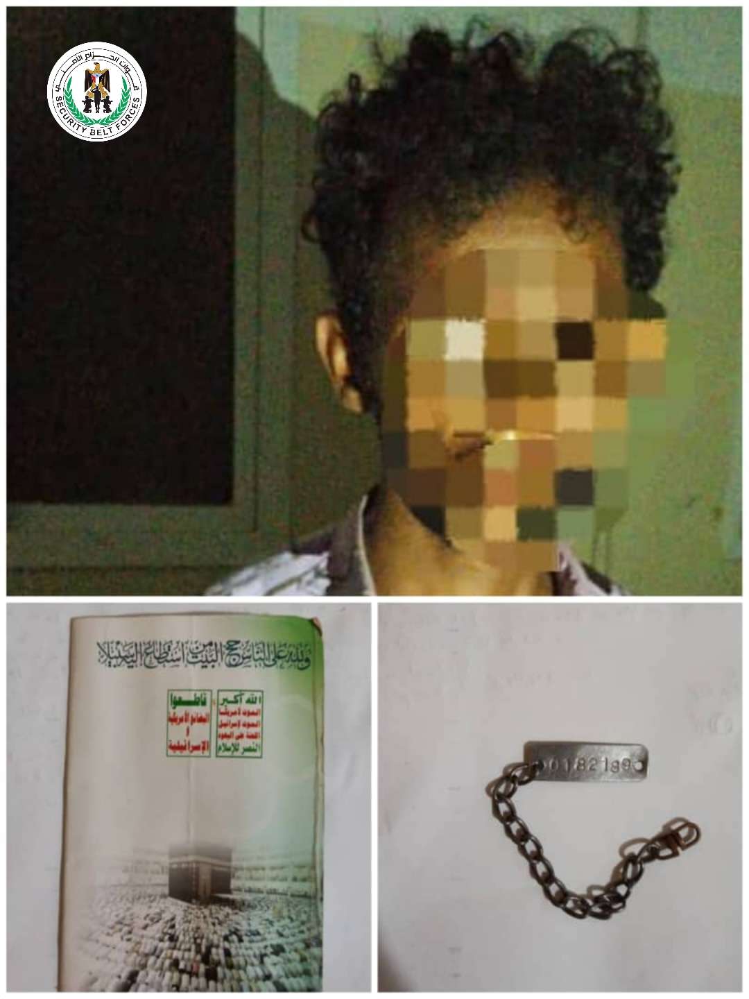 وفي التفاصيل, أوضحت عمليات قوات الحزام الأمني بالمحافظة أن نقطة فجائية لكتيبة طوارئ قوات الحزام أوقفت شخصا قادما من منطقة جبل رأس بالحديدة حاول دخول العاصمة عدن, مضيفة “أثناء تفتيش أمتعته عثر بحوزته على ملازم تتبع لميليشيا الحوثي وشعارها، إضافة إلى سوار مثبت على يده وعليه رقم تستخدمه المليشيات للتعرف على عناصرها في الجبهات”.
