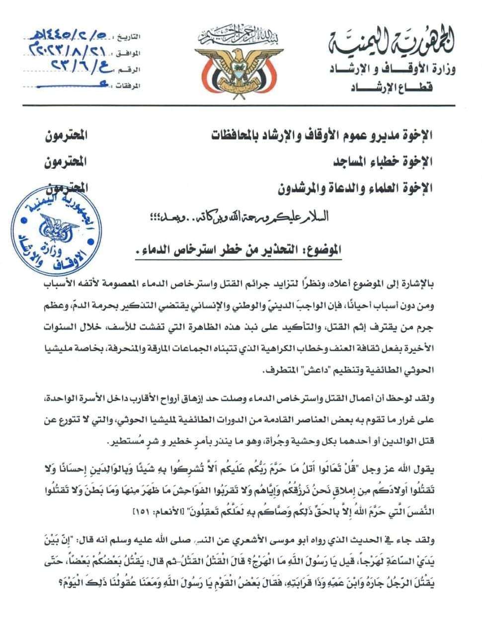 وأردف البيان "ولقد لوحظ أن أعمال القتل واسترخاص الدماء وصلت حد إزهاق أرواح الأقارب داخل الأسرة الواحدة، على غرار ما تقوم به بعض العناصر القادمة من الدورات الطائفية لمليشيا الحوثي، والتي لا تتورع عن قتل الوالدين أو أحدهما بكل وحشية وجُرأة، وهو ما ينذر بأمرٍ خطير و شرٍ مُستطير.