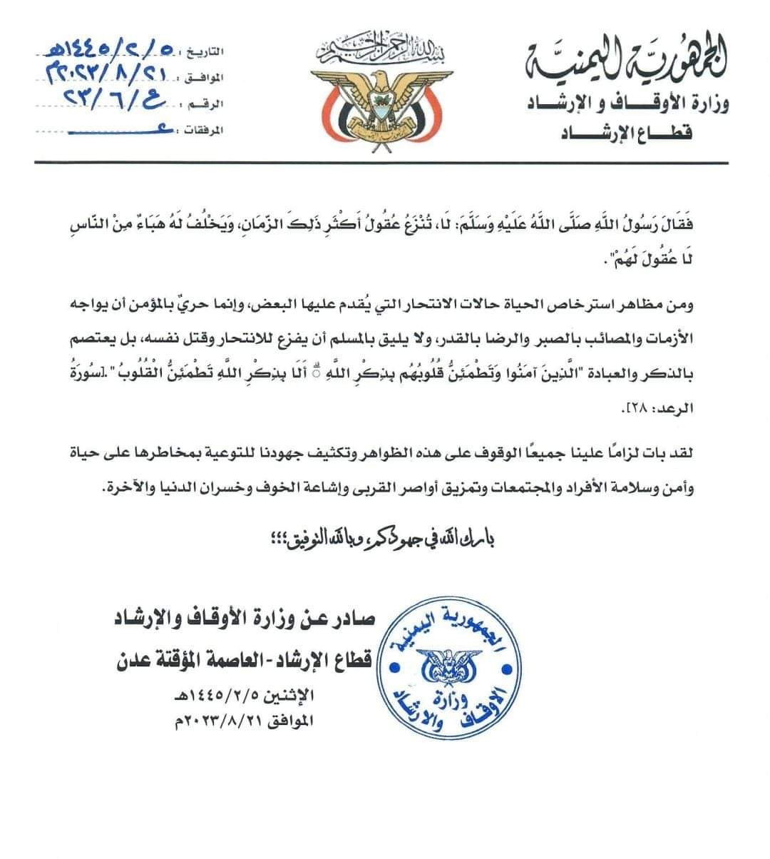 وأشارت الوزارة إلى مظاهر استرخاص الحياة ومنها حالات الانتحار التي يُقدم عليها البعض، وإنما حريٌ بالمؤمن أن يواجه الأزمات والمصائب بالصبر والرضا بالقدر، ولا يليق بالمسلم أن يفزع للانتحار وقتل نفسه، بل يعتصم بالذكر والعبادة "الَّذِينَ آمَنُوا وَتَطْمَئِنُّ قُلُوبُهُم بِذِكْرِ اللَّهِ ۗ أَلَا بِذِكْرِ اللَّهِ تَطْمَئِنُّ الْقُلُوبُ ".[سُورَةُ الرعد: ٢٨].