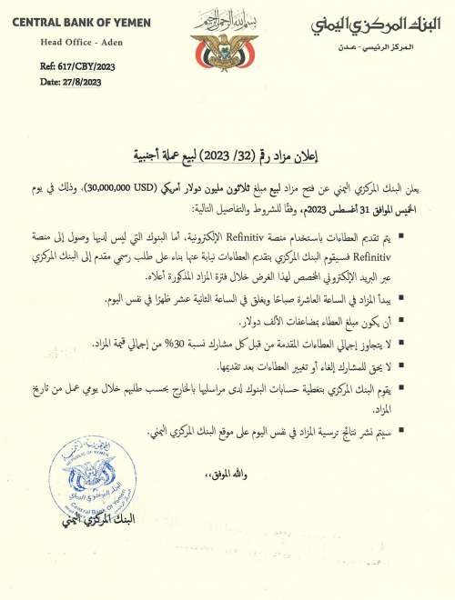 أعلن البنك المركزي اليمني عن فتح مزاد (إستثنائي) لبيع مبلغ ثلاثين مليون دولار أمريكي (30,000,000 USD)، وذلك في يوم الخميس الموافق 31 أغسطس 2023م، وفقًا للشروط والتفاصيل التالية: