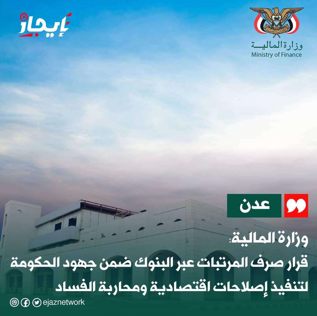 وأكد المصدر مضي الحكومة ووزارة المالية قدمًا في مواجهة الفساد المالي والإداري، وتجفيف منابعه في مؤسسات الدولة، وتصحيح الاختلالات في ملف مرتبات الموظفين المدنيين والعسكريين والأمنيين، من خلال تطبيق قرار صرف المرتبات عبر البنوك المؤهلة، "الذي سيساهم بشكل كبير في ضبط أي تلاعب أو صرف مرتبات للأسماء الوهمية والمزدوجة والمنقطعة عن العمل في مؤسسات الدولة".