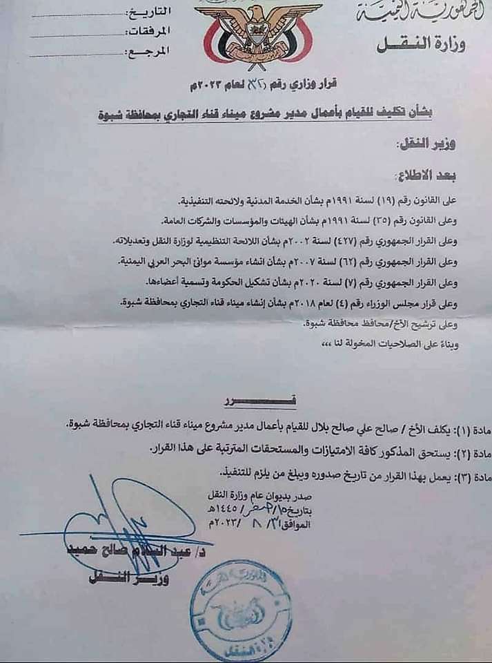 أصدر معالي وزير النقل الدكتور عبدالسلام صالح حميد قرار رقم (32) لسنة ٢٠٢٣م قضى: بتكليف الأخ/ صالح علي صالح بلال - مدير لمشروع ميناء قنا التجاري بمحافظة شبوة..