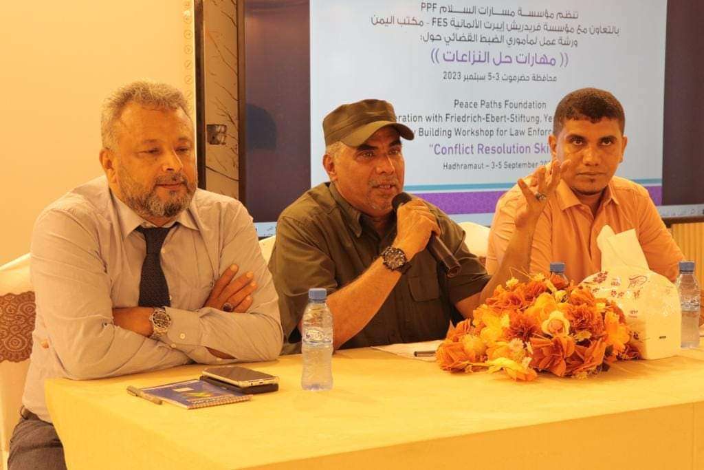 دشّن المدير العام لأمن وشرطة ساحل حضرموت، العميد مطيع سعيد المنهالي، اليوم الأحد بالمكلا، ورشة عمل لمأموري الضبط القضائي، حول مهارات حل النزاعات التي تنفذها مؤسسة مسارات السلام بتمويل من منظمة فريدريش إيبرت الألمانية.