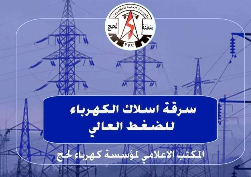 أعلنت مؤسسة كهرباء محافظة لحج عن وقوع سرقة جديدة بأسلاك نقل التيار الكهربائي