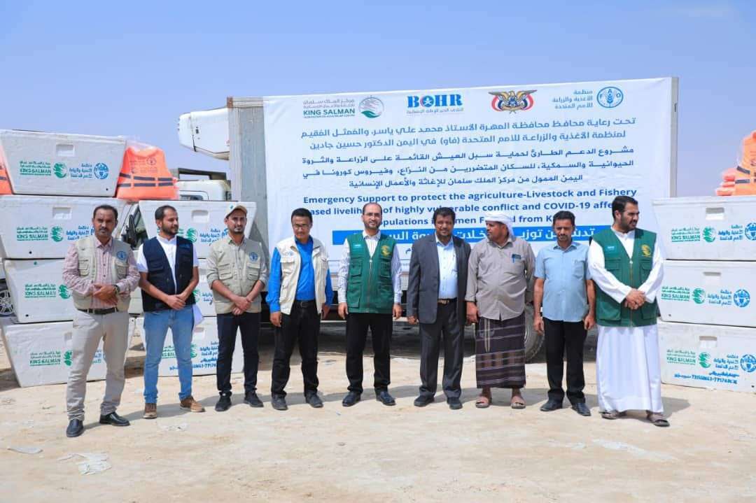 دشن الأمين العام للمجلس المحلي بمحافظة المهرة الأستاذ سالم عبدالله نيمر اليوم الاثنين توزيع مدخلات الثروة السمكية، ضمن مشروع الدعم الطارئ لحماية سبل العيش القائمة على الزراعة والثروة الحيوانية والسمكية للسكان المتضررين من النزاع وفيروس كورونا في اليمن الممول من مركز الملك سلمان للإغاثة والأعمال الإنسانية عبر منظمة الأمم المتحدة للأغذية والزراعة (فاو)، وبالتنسيق مع هيئة المصائد السمكية.
