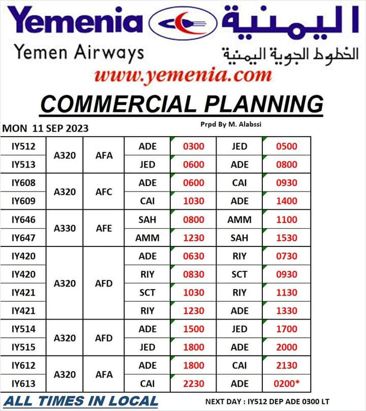 حفظ الصورة مواعيد رحلات طيران اليمنية ليوم غد الإثنين 11 سبتمبر 2023 الأحد ١٠ سبتمبر ٢٠٢٣ الساعة ١٠:١٣ مساءً متابعات/ مجال نت