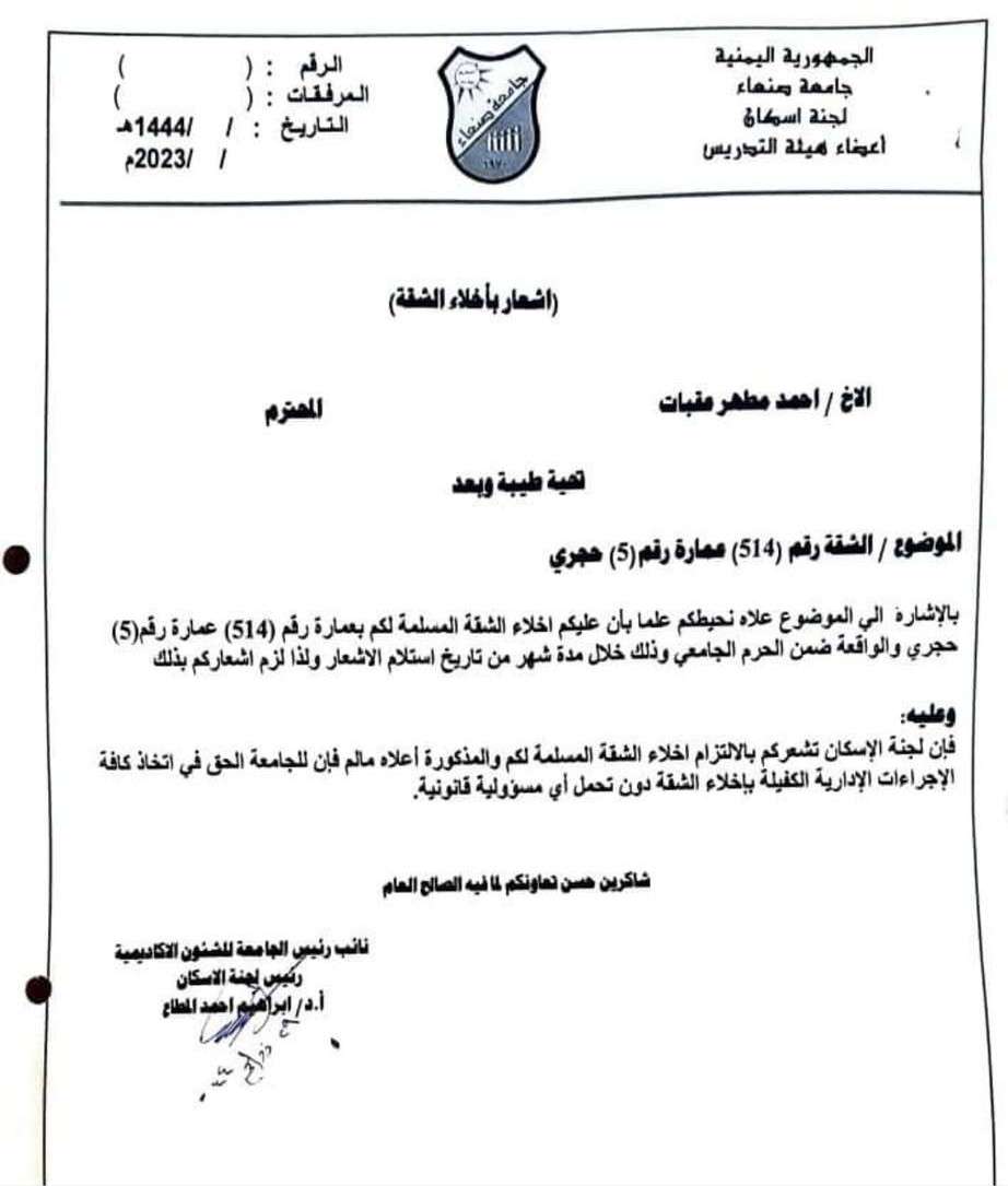 و قال عقبات مرفقا صورة من اشعار سلم له لاخلاء المنزل من قبل رئيس الجامعة : مكافأة غير متوقعة لخدمة حوالي نصف قرن، بدأت بإنذار غير قانوني بالخروج من السكن الجامعي، وأنتهت بنهب ممتلكات من الشقة.. ماهكذا تورد الإبل! .