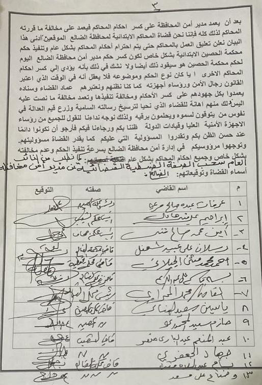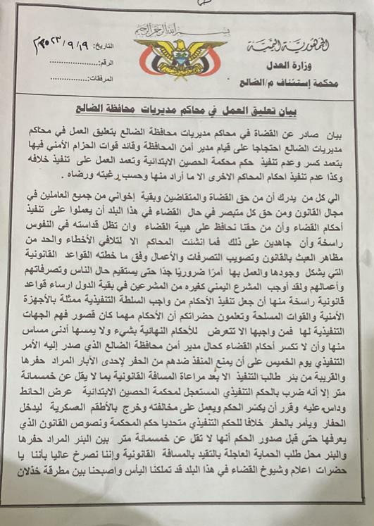 أصدر صباح هذا اليوم الثلاثاء الموافق ١٩ سبتمبر ٢٠٢٣ عددا من قضاة محاكم محافظة الضالع بيان اعلنوا فيه عن تعليق العمل بالمحاكم احتجاجا على ممارسات قائد في الحزام الأمني وإدارة أمن الضالع لممارساتهم التي تهين السلطة القضائية وتعرقل تطبيق القوانين في محافظة. الضالع.. بحسب البيان