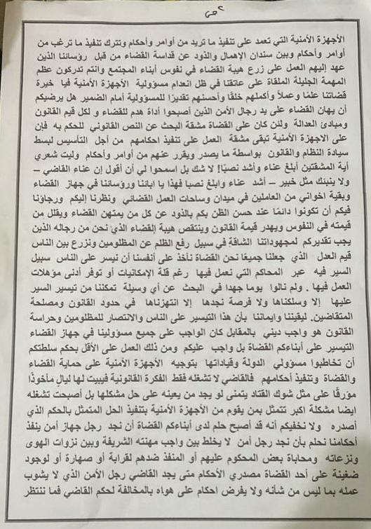 وتحدث البيان الذي ذُيل بتوقيع رؤساء محاكم وقضاة الضالع حول تعمد قائد الحزام الأمَني ،وادارة امن المحافظة كسر أحكام القضاء ومساعدة بعض من صدرت ضدهم أحكام على مخالفتها وإهانة. السلطة القضائية في تصرف غريب ومتعمد هدفه تعطيل أعمال القضاء في المحافظة .
