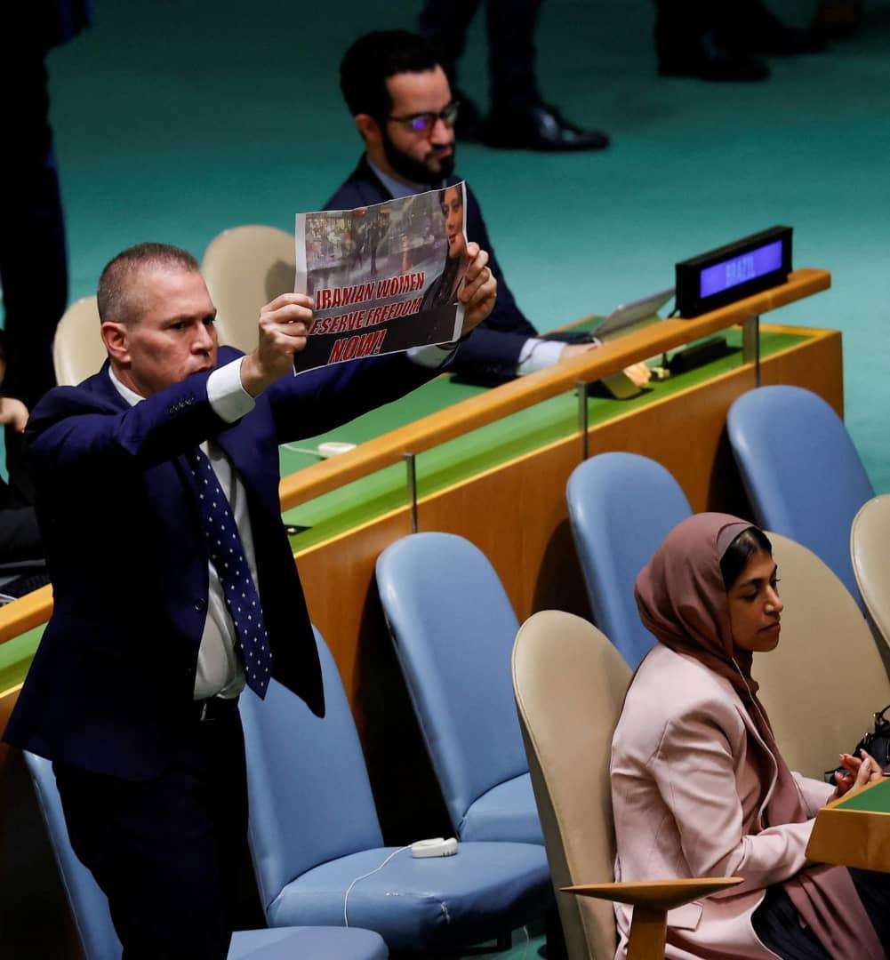 احتجاز سفير إسرائيل لدى «الأمم المتحدة» بعد رفعه صورة مهسا أميني خلال كلمة رئيسي
