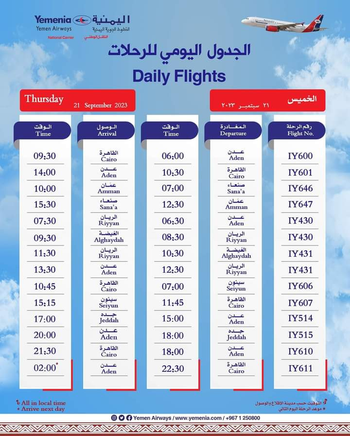 حفظ الصورة مواعيد رحلات طيران اليمنية ليوم غد الخميس 21 سبتمبر 2023 الأربعاء ٢٠ سبتمبر ٢٠٢٣ الساعة ٠٩:٠٧ مساءً متابعات/ مجال نت
