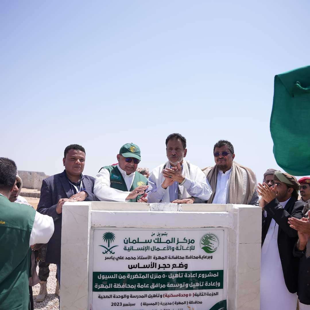 وخلال وضع حجر الأساس الذي حضره - الأمين العام للمجلس المحلي الأستاذ سالم عبدالله نيمر، ووكيل المحافظة للعلاقات العامة الأستاذ محمد محسن رعفيت والقائم بأعمال وكيل الشؤون الفنية المهندس عوض قويزان، ومدير مكتب مركز الملك سلمان للإغاثة بمحافظة المهرة الأستاذ عبدالله العنقري- أشاد المحافظ بن ياسر بالمشاريع الإنسانية لمركز الملك سلمان للإغاثة في اليمن بشكل عام ومحافظة المهرة بشكل خاص، لافتاً إلى النجاح الذي حققته المرحلة الأولى في توفير مأوى وسكن للأسر المتضررة واستقرارها بعد الاضرار التي خلفها إعصار لبان والأعاصير التي ضربت المحافظة خلال السنوات الأخيرة.