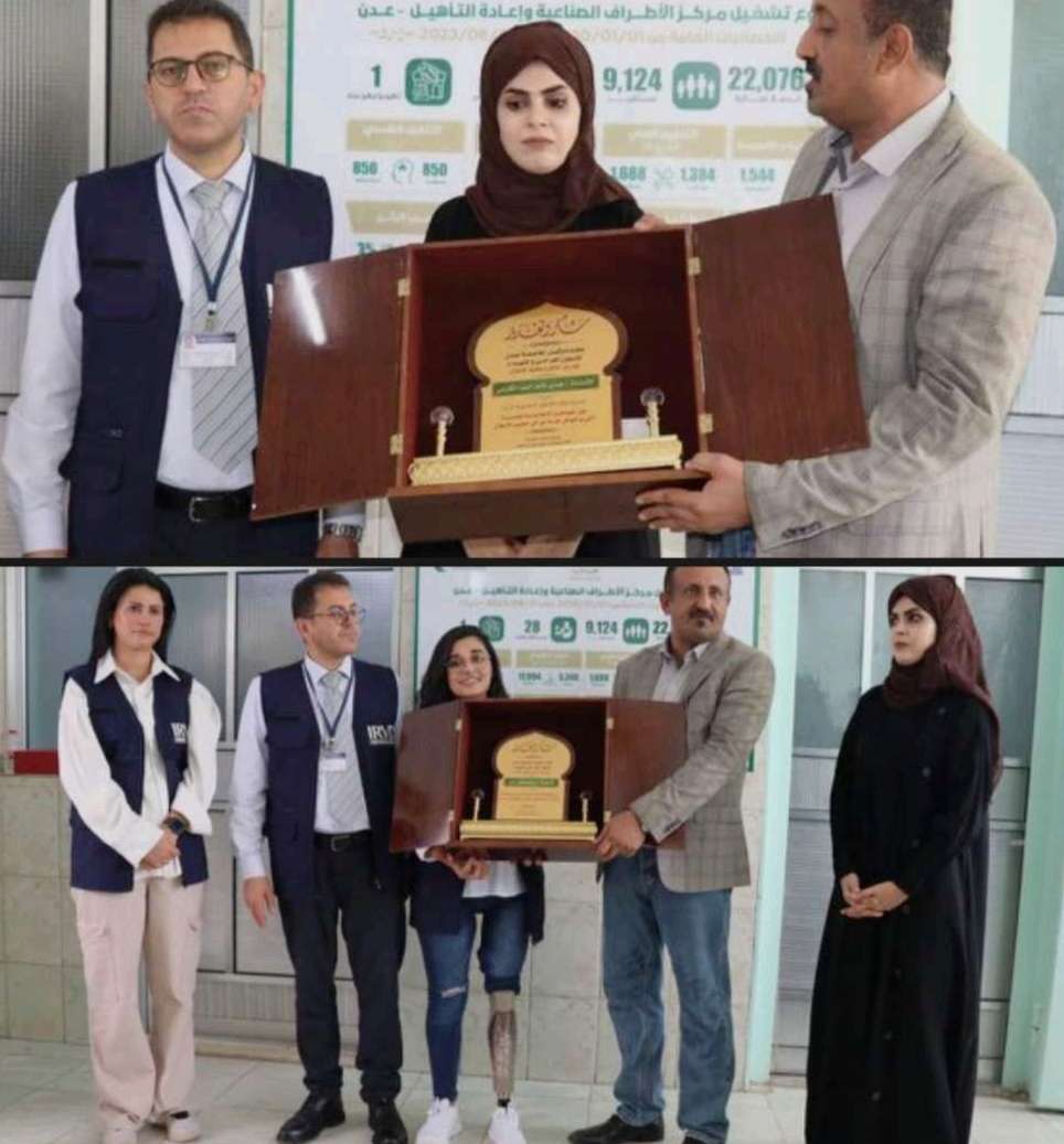وجري عملية التكريم في مركز عدن للاطراف للالصناعية واعادة التأهيل المدعوم من قبل مركز الملك سلمان للإغاثة والأعمال الإنسانية في إطار برنامج تكريمي يستهدف القائمين على المركز الذي يقوم بخدمة مئات المصابين مجاناً.