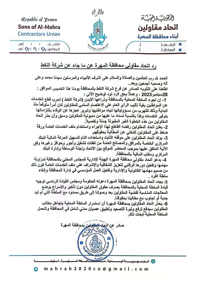 توضيح من اتحاد مقاولي محافظة المهرة على ماجاء عن شركة النفط