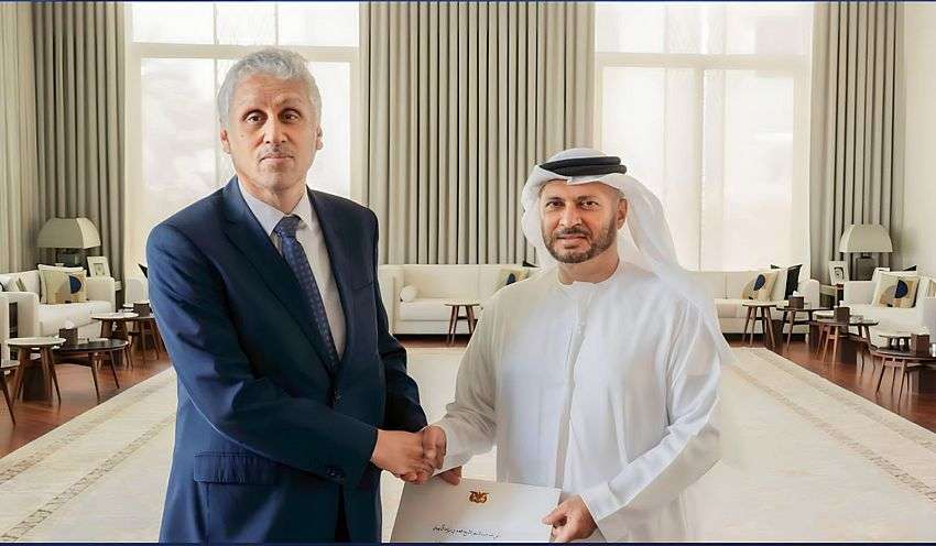 سلم الرسالة سفير اليمن لدى دولة الامارات فهد المنهالي، خلال لقائه اليوم الخميس المستشار الدبلوماسي لرئيس الدولة الدكتور أنور محمد قرقاش.