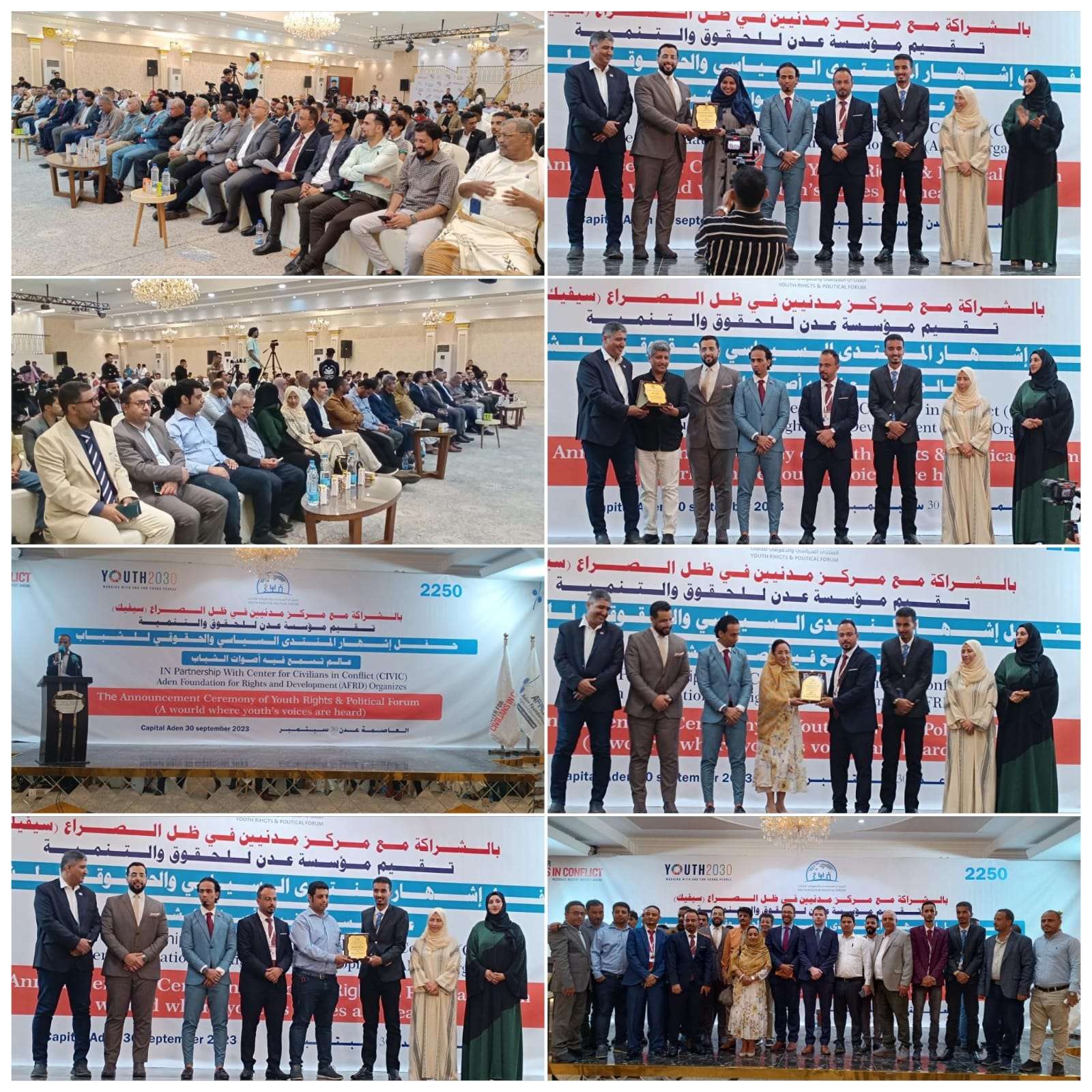 نظمت مؤسسة عدن للحقوق والتنمية بالشراكة مع مركز مدنيين في ظل الصراع ( سيفيك) اليوم في العاصمة عدن حفل إشهار المنتدى السياسي والحقوقي للشباب تحت شعار "عالم تسمع فيه أصوات الشباب".