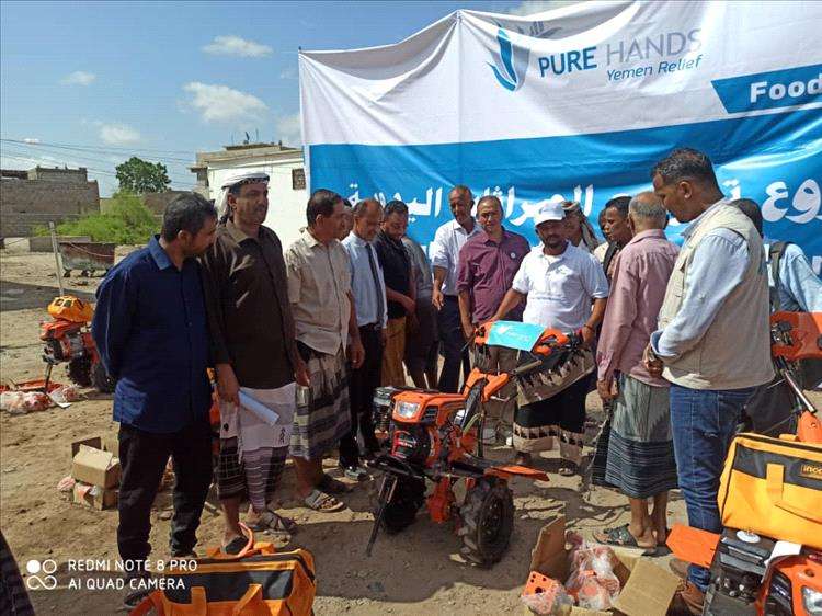 من جانبه قال عمر الصماتي : اليوم ندشن هذا المشروع الخاص بتوزيع الحراثات اليدوية وعددها 40 حراثة وهي تستهدف صغار المزارعين بتبن وهي مقدمة من بيور هنس التي تقدم دعم للعديد من المشاريع في قطاع التعليم والصحة و المياه والزراعة والأمن الغذائي في اليمن .