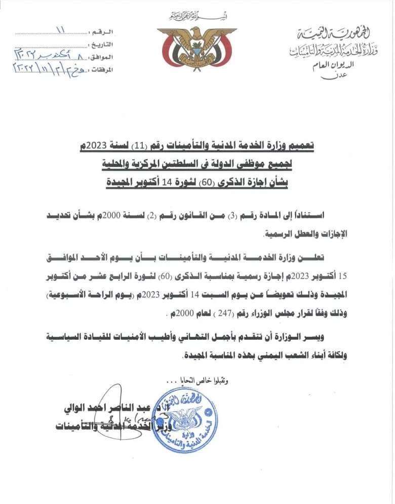 أعلنت وزارة الخدمة المدنية والتأمينات، أن يوم الأحد الموافق 15 من أكتوبر، إجازة رسمية لجميع موظفي الدولة في السلطتين المركزية والمحلية، وذلك بمناسبة الذكرى الـ60 لثورة الرابع عشر من أكتوبر، تعويضًا عن يوم السبت 14 أكتوبر 2023 " يوم الراحة الأسبوعية".