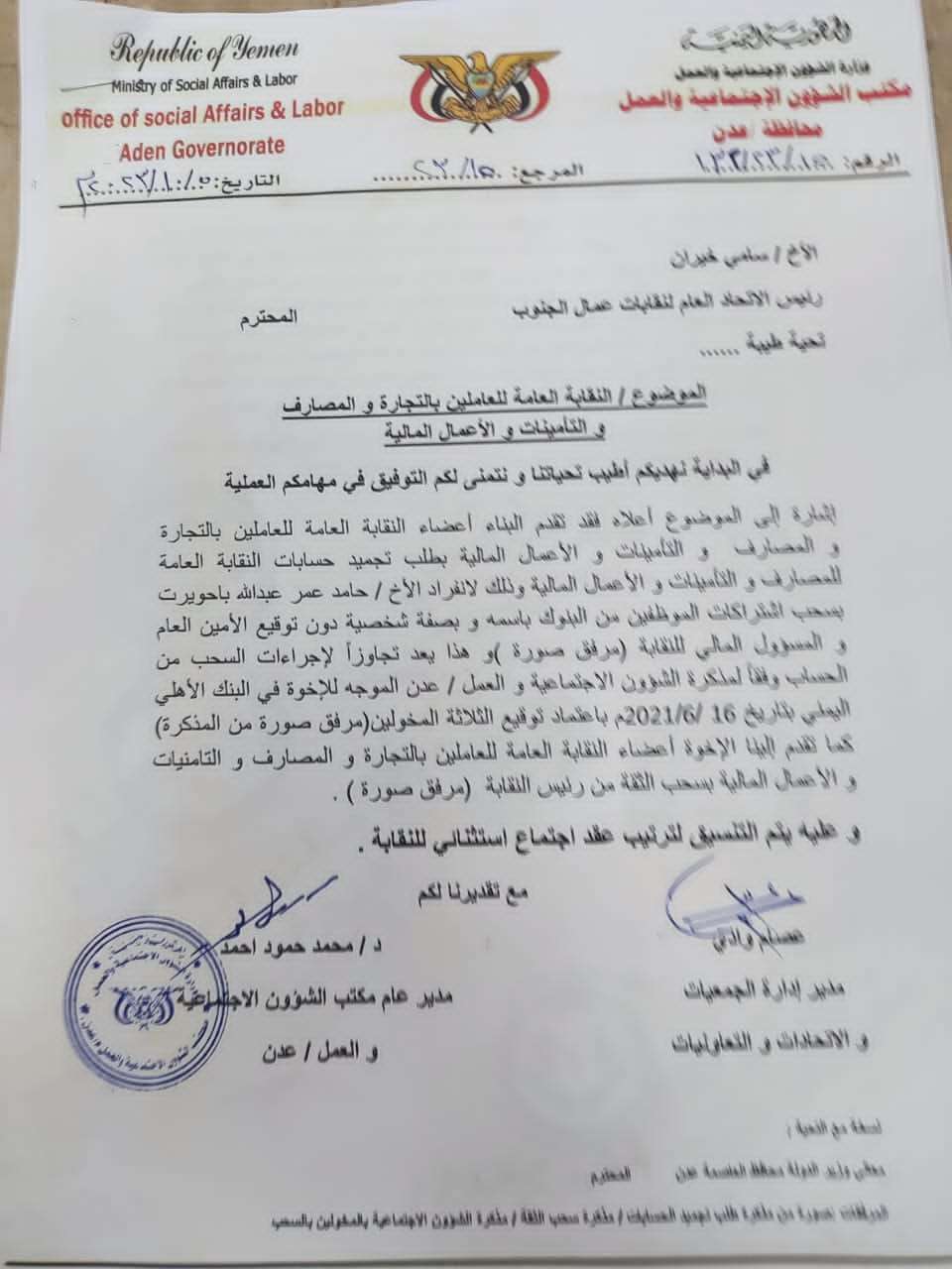أعلنت وزارة الشؤون الاجتماعية إنهاء أزمة نقابة المصارف بسحب الثقة عن رئيس نقابة المصارف والبنوك حامد باحويرث.