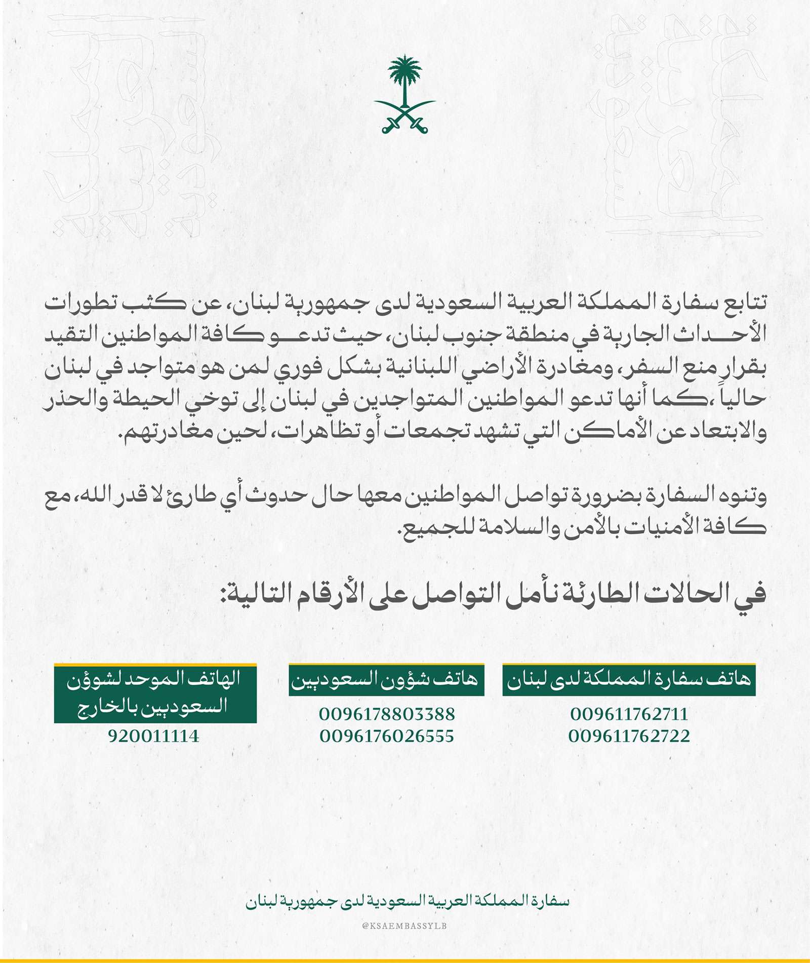 وقالت السفارة السعودية في لبنان عبر حسابها الرسمي على منصة "إكس" : "تتابع سفارة المملكة العربية السعودية لدى جمهورية ،لبنان، عن كثب تطورات الأحداث الجارية في منطقة جنوب لبنان، حيث تدعو كافة المواطنين التقيد بقرار منع السفر، ومغادرة الأراضي اللبنانية بشكل فوري لمن هو متواجد في لبنان حالياً ، كما أنها تدعو المواطنين المتواجدين في لبنان إلى توخي الحيطة والحذر والابتعاد عن الأماكن التي تشهد تجمعات أو تظاهرات، لحين مغادرتهم".