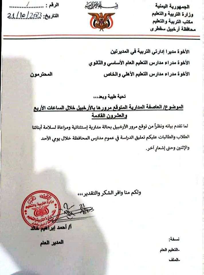 أعلن مدير عام مكتب وزارة التربية والتعليم بمحافظة أرخبيل سقطرى أحمد إبراهيم خالد تعليق الدراسة في عموم مدارس المحافظة.