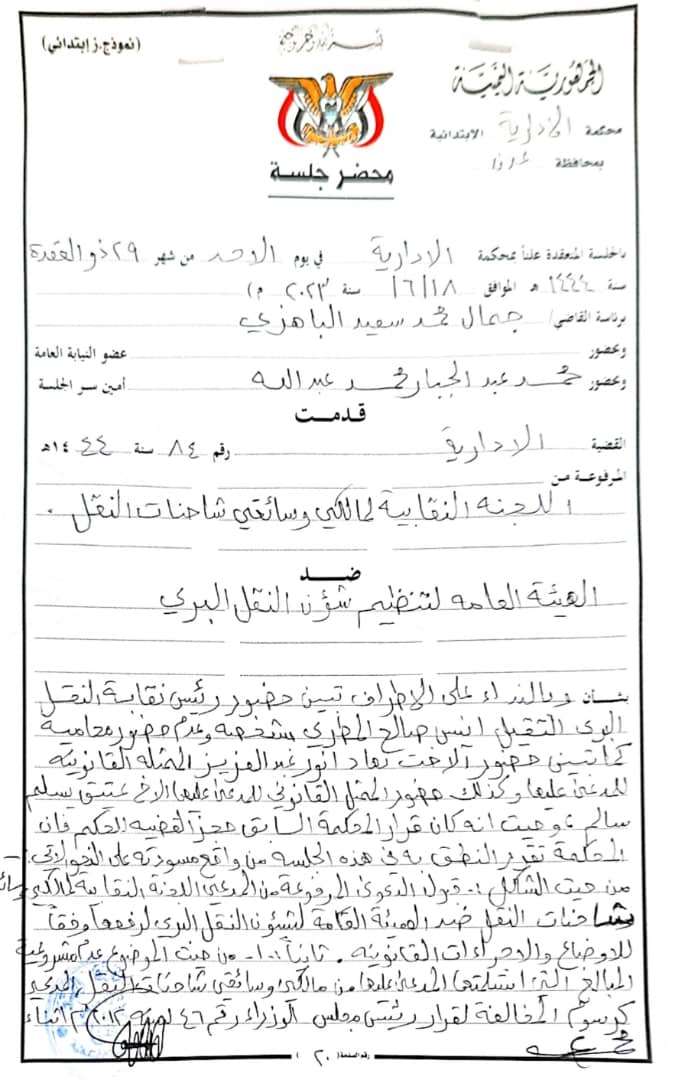 ومنها نقابة النقل الثقيل برئاسة النقابي/ أنيس المطري رئيس النقابة الذي حاز على أغلب أصوات الناخبين وهو الرئيس الشرعي للنقابة وفقا للقانون ولا يمكن بقرار من مكتب تنفيذي معين إلغاء شرعية الانتخابات وقرارات القضاء والنيابة التي تؤكد إستمرار عمل النقابة.