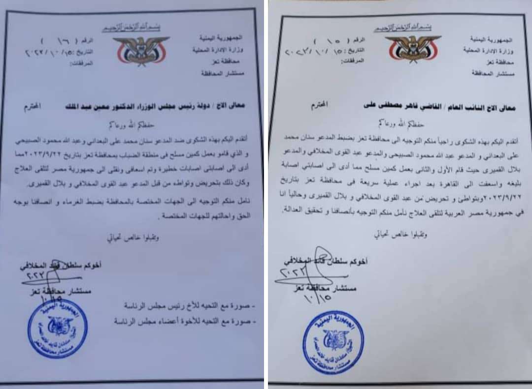 وأكد "المخلافي" في الشكوى المرفوعة إلى رئيس الحكومة والنائب العام، بأن (عبدالقوي المخلافي، وبلال القميري) متورطان في القضية، من خلال التواطئ مع الجناة المتورطين في ارتكاب جريمة محاولة الإغتيال.. وطالب بانصافه واتخاذ الإجراءات القانونية الرادعة ضد الجناة والمحرضين.