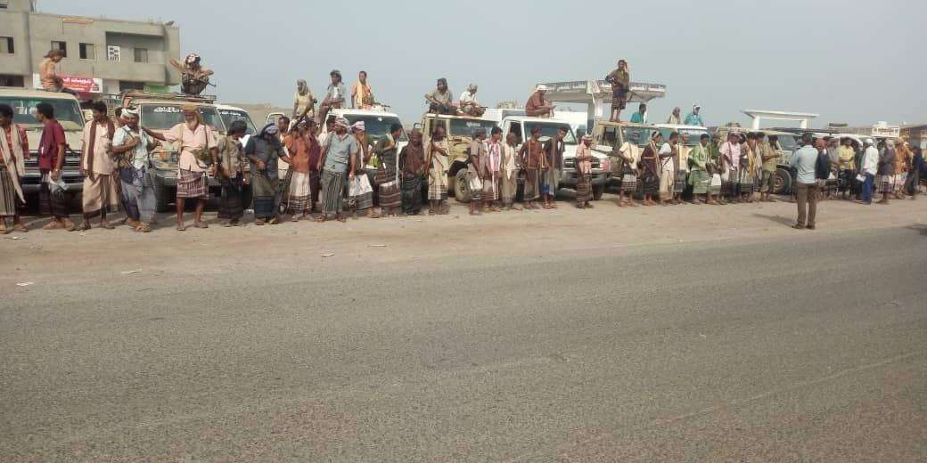 وقفة احتجاجية لمشائخ الصبيحة وردفان وشبوة للمطالبة بالإفراج عن رجل الأعمال عامر العريفة.