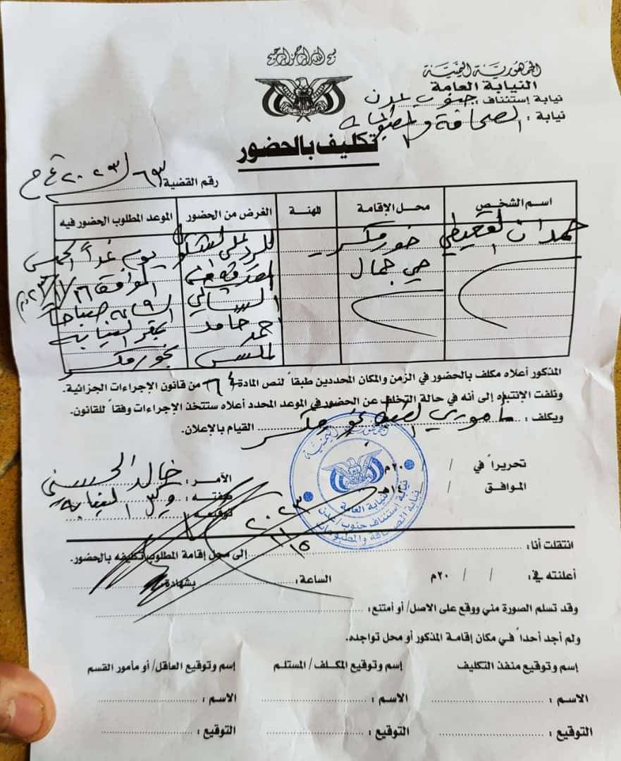 استدعت نيابة الصحافة والمطبوعات صحفي بعدن عقب اتهامه المحافظ بشراء فيلا في الاردن.