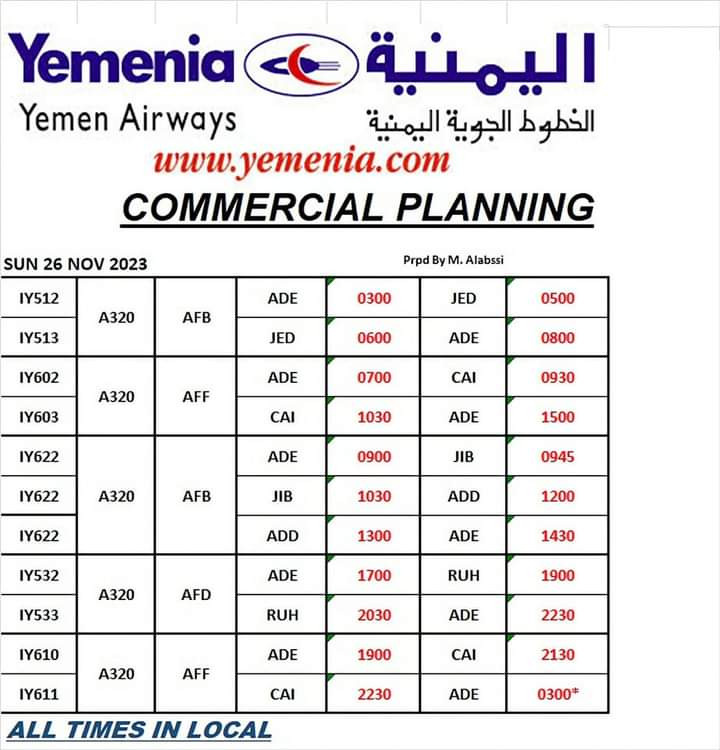 حفظ الصورة مواعيد رحلات طيران اليمنية ليوم غد الأحد 26 نوفمبر 2023 السبت ٢٥ نوفمبر ٢٠٢٣ الساعة ٠٤:٤٢ مساءً عدن/ مجال نت