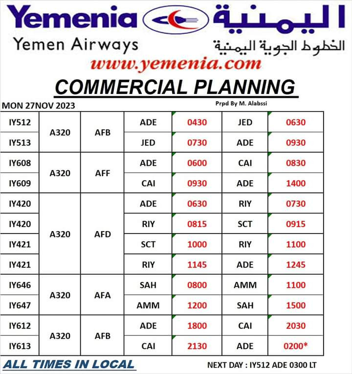 حفظ الصورة مواعيد رحلات طيران اليمنية ليوم غد الإثنين 27 نوفمبر 2023 الأحد ٢٦ نوفمبر ٢٠٢٣ الساعة ٠٤:٠٦ مساءً عدن/ مجال نت