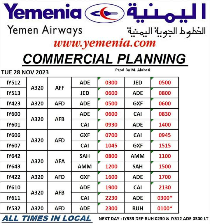 حفظ الصورة مواعيد رحلات طيران اليمنية ليوم غد الثلاثاء 28 نوفمبر 2023 الإثنين ٢٧ نوفمبر ٢٠٢٣ الساعة ٠٤:٢١ مساءً عدن/ مجال نت