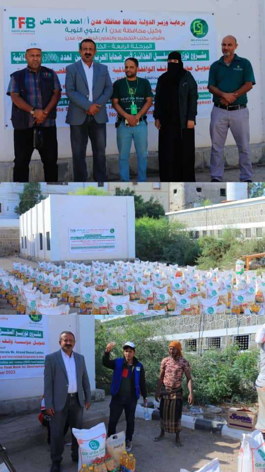 دشن وكيل محافظة عدن لشئون الشهداء والجرحى، علوي ناصر النوبة، اليوم، مشروع توزيع السلل الغذائية لأسر ضحايا الحرب المدنيين لعدد (3000) سلة غذائية ضمن المرحلة (الرابعة والخامسة)، التي ينفذها بنك الطعام للتنمية (TFB) بتمويل من مؤسسة وقف الواقفين العالمية.