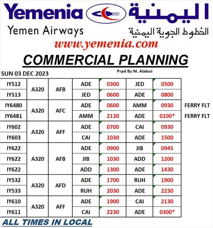 حفظ الصورة مواعيد رحلات طيران اليمنية ليوم الأحد 3 ديسمبر 2023 السبت ٠٢ ديسمبر ٢٠٢٣ الساعة ٠٩:٥٨ مساءً متابعات/ مجال نت