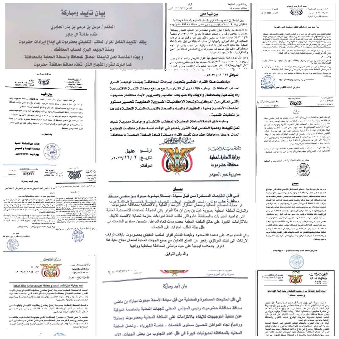 وأعلنوا في بيانات تأييد وقوفهم الى جانب السلطة المحلية والمكتب التنفيذي بالمحافظة بقيادة محافظ حضرموت رئيس المجلس المحلي الأستاذ مبخوت مبارك بن ماضي، مشيرين في بياناتهم إلى ان حصول محافظة حضرموت على حقوقها كاملة حق مشروع إسوة بغيرها من المحافظات، موضحين ان ذلك الاهمال واللامبالاة قد تسبب في قصور واضح في الخدمات الأساسية للمواطنين وتدهور في البنية التحتية، مطالبين الحكومة بالإيفاء بالتزاماتها تجاه حضرموت التي عكست صورة مشرّفة للوطن بحفاظها على مؤسسات الدولة وضربت مثالاً في الأمن والاستقرار، وظلت لأكثر من 30 عامًا ترفد ميزانية الدولة بأكثر من 70% من موازنتها السنوية.