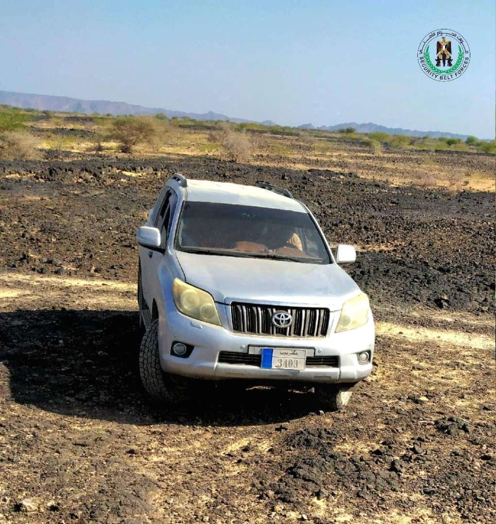 استعادة قوات الحزام الأمني الساحل في محافظة أبين، اليوم، سيارة بعد سرقتها وخطفها من الخط الدولي العام من قبل مجموعة مسلحة خارجة عن النظام والقانون.