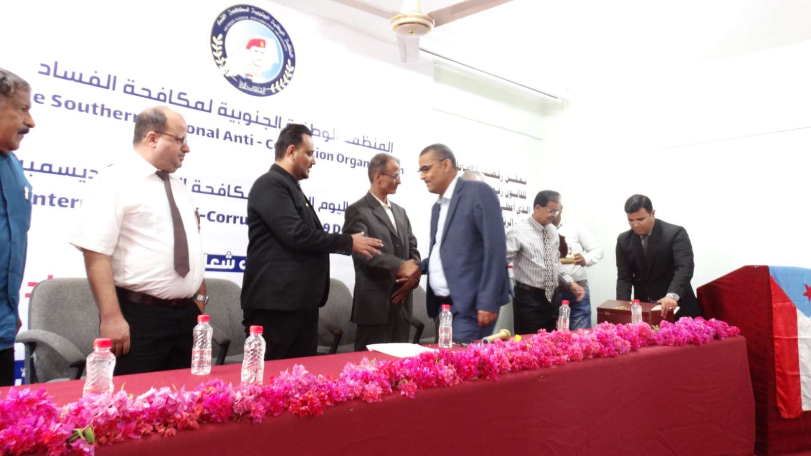 واختتمت الفعالية - التي احتضنتها كلية المجتمع بمديرية دار سعد، وتخللتها العديد من الكلمات والمداخلات التي أكدت بمجملها على المضي قدماً في مكافحة هذه الآفة وكشف من يقفون خلفه - اختتمت بتكريم عدد من الشخصيات والقيادات المساندة للمنظمة في جهودها لمكافحة الفساد وتذليل بعض الصعوبات التي اعترضت سير عملها.