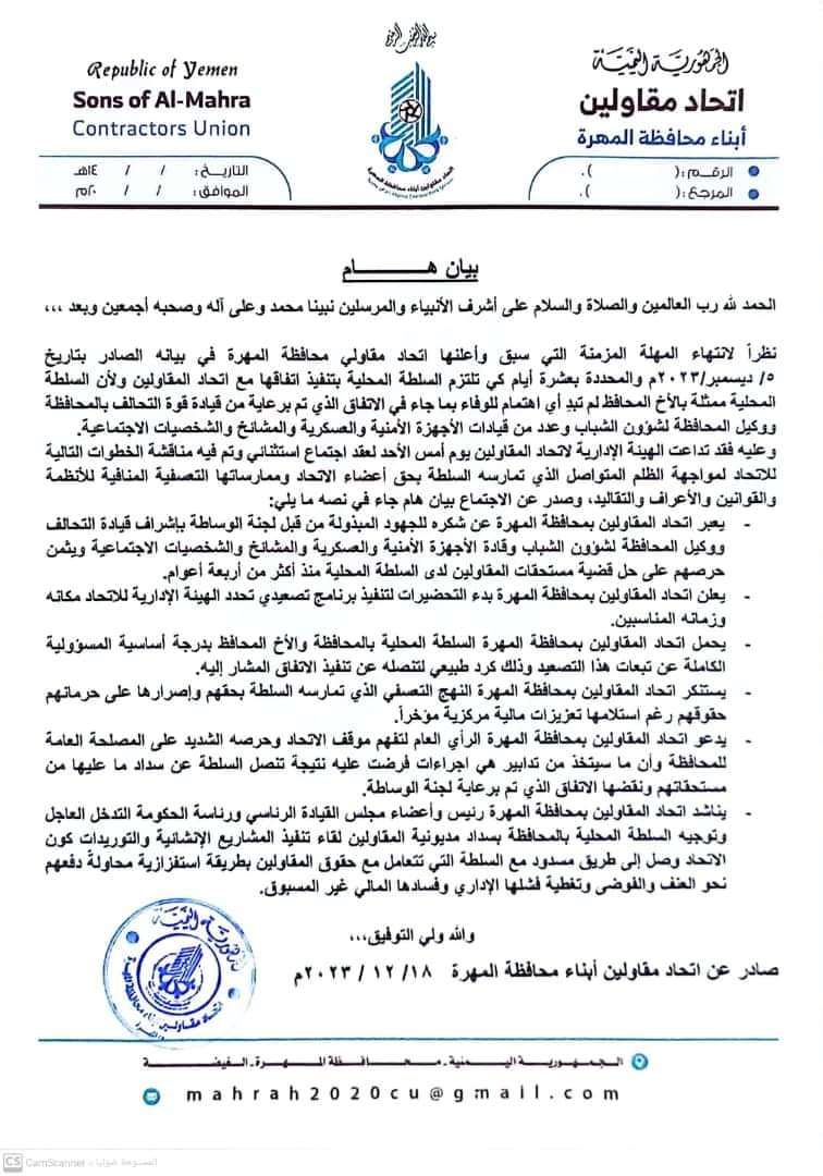 نظراً لانتهاء المهلة المزمنة التي سبق وأعلنها اتحاد مقاولي محافظة المهرة في بيانه الصادر بتاريخ 5/ ديسمبر/2023م والمحددة بعشرة أيام كي تلتزم السلطة المحلية بتنفيذ اتفاقها مع اتحاد المقاولين ولأن السلطة المحلية ممثلة بالأخ المحافظ لم تبدِ أي اهتمام للوفاء بما جاء في الاتفاق الذي تم برعاية من قيادة قوة التحالف بالمحافظة ووكيل المحافظة لشؤون الشباب وعدد من قيادات الأجهزة الأمنية والعسكرية والمشائخ والشخصيات الاجتماعية.