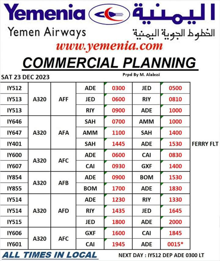 حفظ الصورة مواعيد رحلات طيران اليمنية ليوم غد السبت 23 ديسمبر 2023 الجمعة ٢٢ ديسمبر ٢٠٢٣ الساعة ٠٤:٤٩ مساءً متابعات/ مجال نت