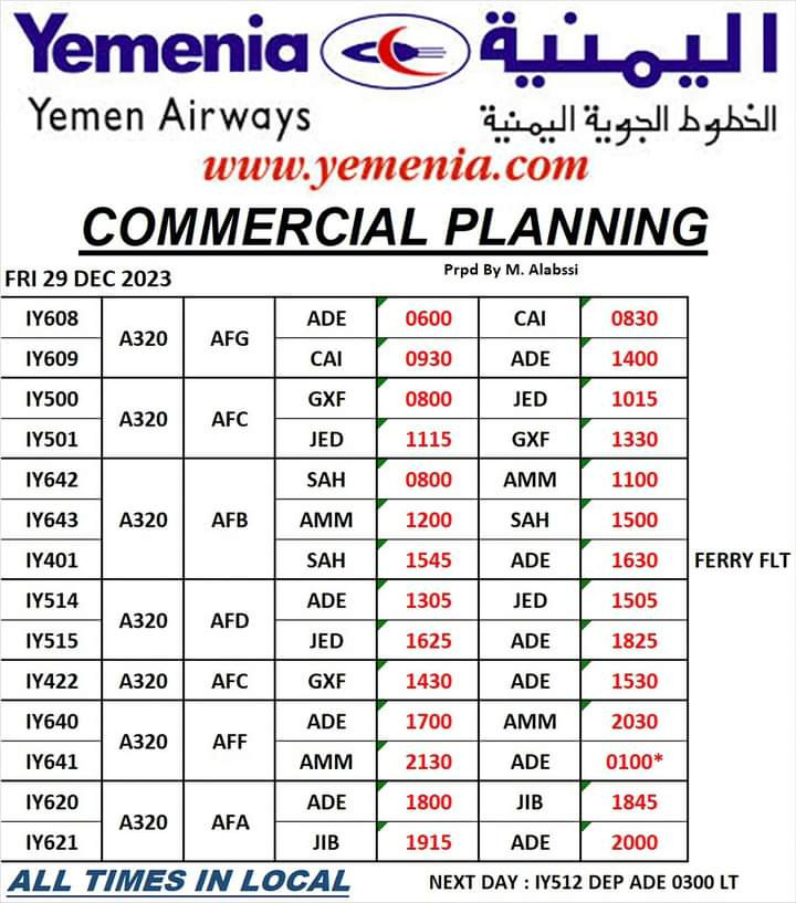 حفظ الصورة مواعيد رحلات طيران اليمنية ليوم غد الجمعة 29 ديسمبر 2023 الخميس ٢٨ ديسمبر ٢٠٢٣ الساعة ٠٨:١٩ مساءً عدن/ مجال نت