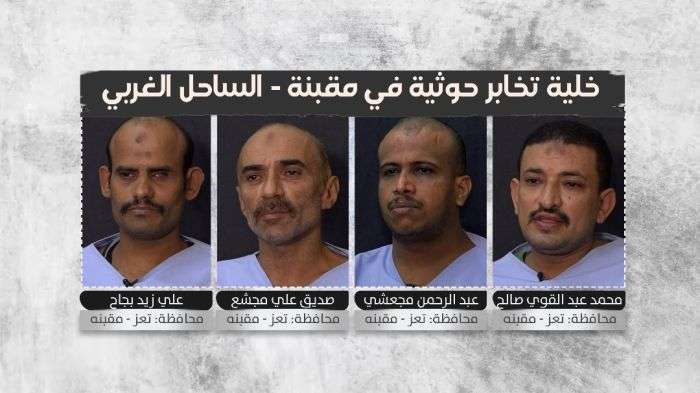وبحسب الاعلام العسكري، فقد شملت الخلية أربعة عناصر جميعهم من أهالي المناطق المحررة في مديرية مقبنة- غرب محافظة تعز وهم: “محمد عبدالقوي بجاش طاهر صالح، عبدالرحمن حامد أحمد عبدالوهاب، صدّيق علي قايد محمد مشجع، علي زيد بجاح”.